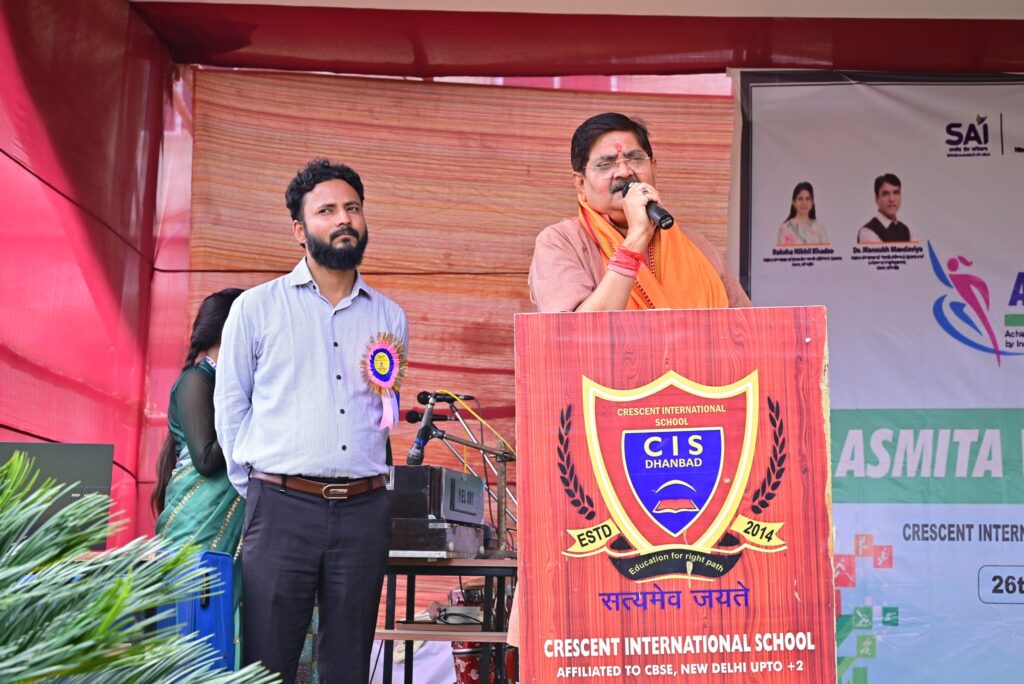The ceremony began with the sacred ritual of lamp lighting (Deep Prajwalan) by our esteemed Chief Guest, Hon’ble MLA Shri Raj Sinha Ji (Dhanbad), in the gracious presence of dignitaries, athletes, and enthusiastic students.